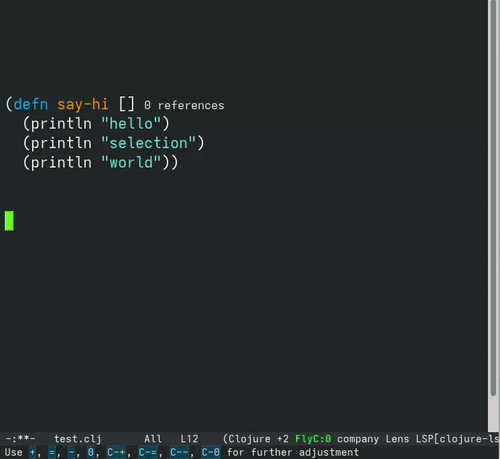 Below you can find all available features that clojure-lsp provides with examples using Emacs lsp-mode as the client.